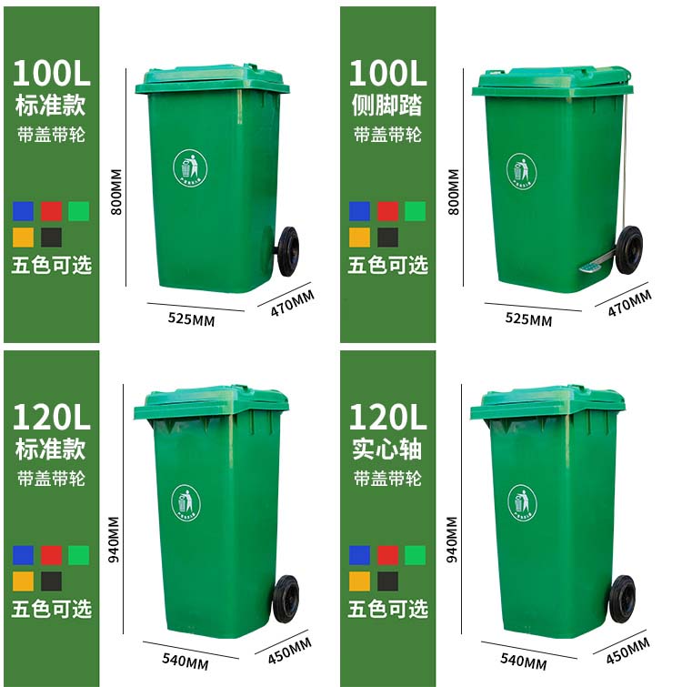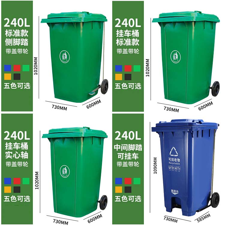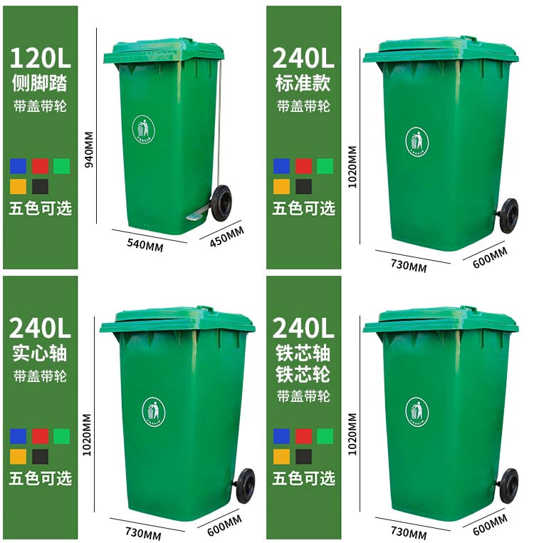 塑料垃圾桶是常見的環衛垃圾桶,現在北京匯眾環藝為您介紹120L和240L的塑料垃圾桶,這兩款有標準款和腳踏款,腳踏款又分側面腳踏和中間腳踏,然而120L和240L是市面上通俗的尺寸說法,具體尺寸尺寸一般很少用。