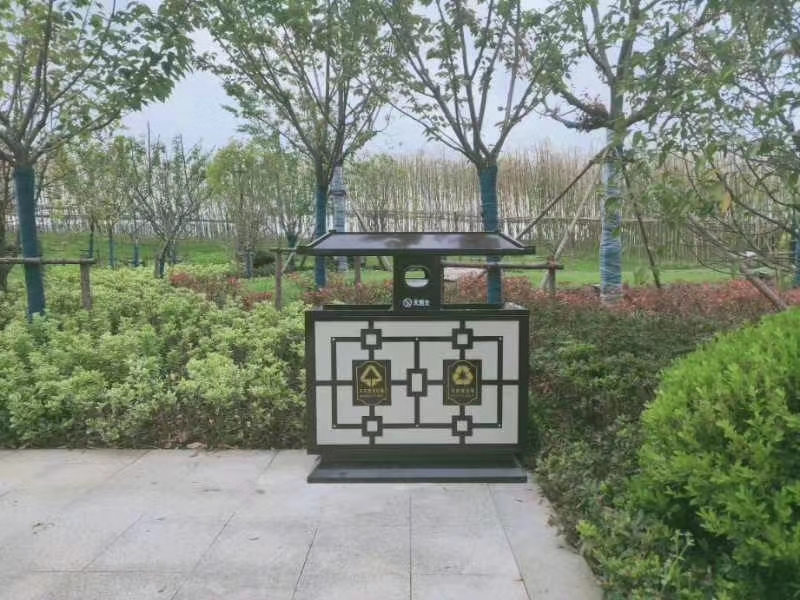 北京匯眾環藝今天為大家推薦的是這款中國風仿古垃圾桶果皮箱外觀仿園林建筑風格設計,采用鋼制鈑金工藝制作焊接成型,表面經酸洗磷化除油等防銹工藝,噴戶外塑粉烤漆可長期戶外擺放耐銹蝕能力提升10倍。不僅有可回收垃圾和不可回收物2分類設置,還有滅煙投口功能齊全,是戶外園林景區及街道果皮收集投放的環衛設施,中國風仿古設計對戶外景觀環境的美化效果不容小覷。